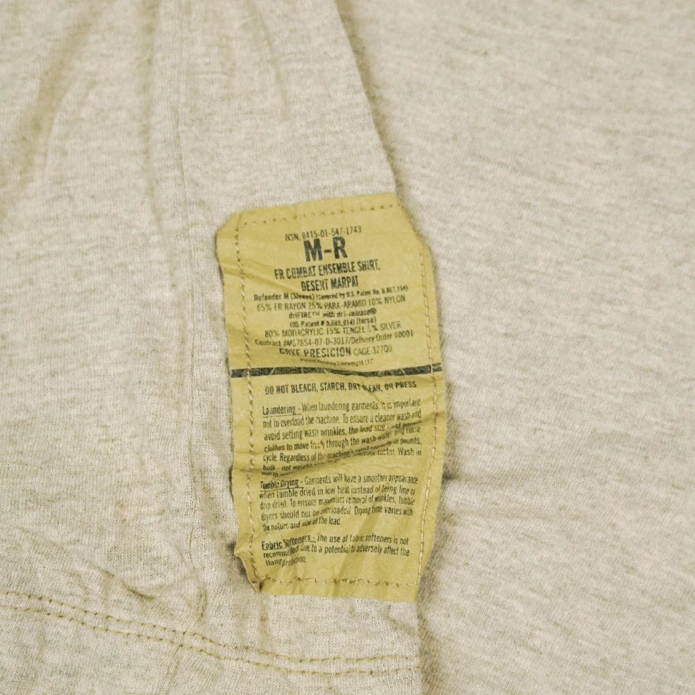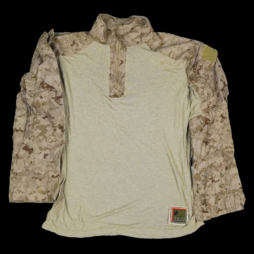 USMC FROG combat shirt in Desert MARPAT camouflage. This is a long-sleeve combat shirt with a patterned sleeve and shoulder section and a contrasting torso panel.
