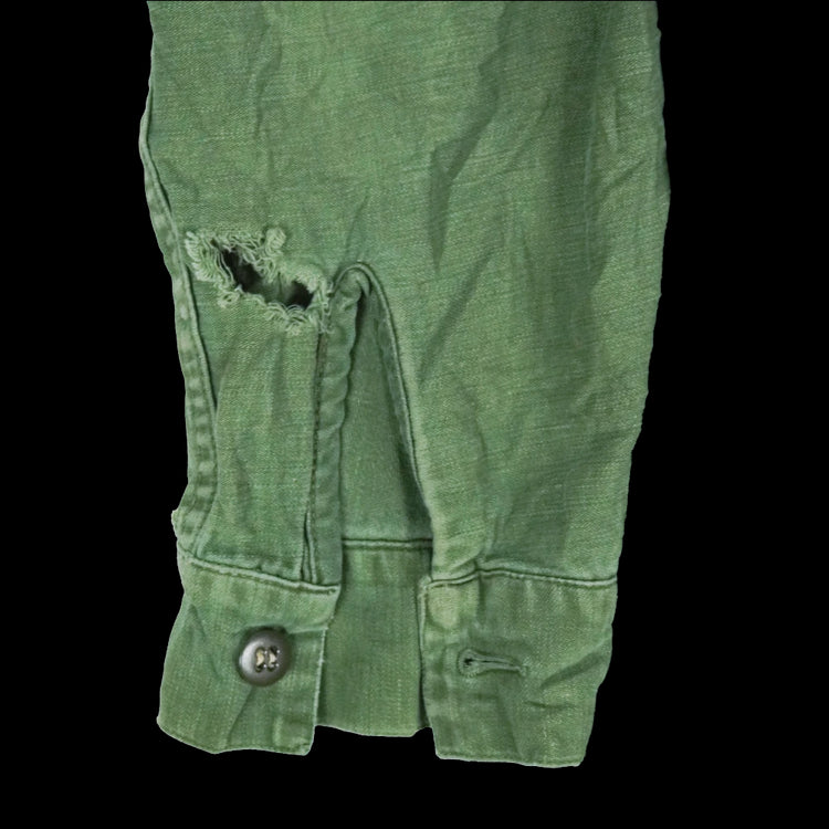 There is a hole by the cuff of the right sleeve, and the cuff button is missing from the left sleeve.