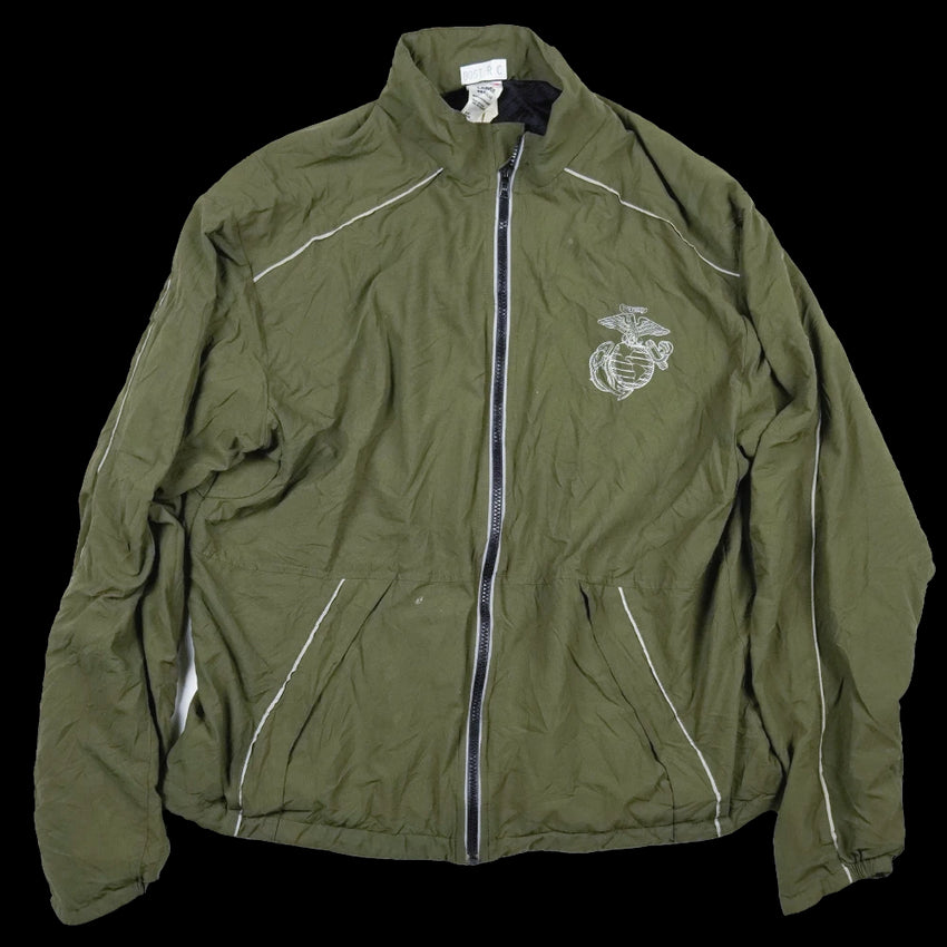 USMC tracksuit jacket in surplus condition. This is a zip-front athletic-style jacket manufactured by New Balance.