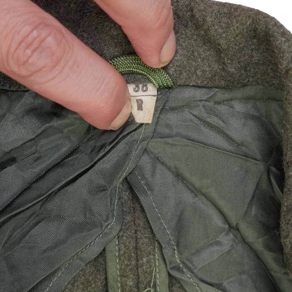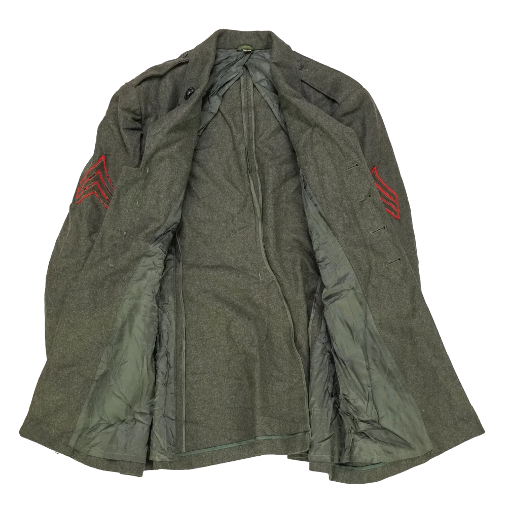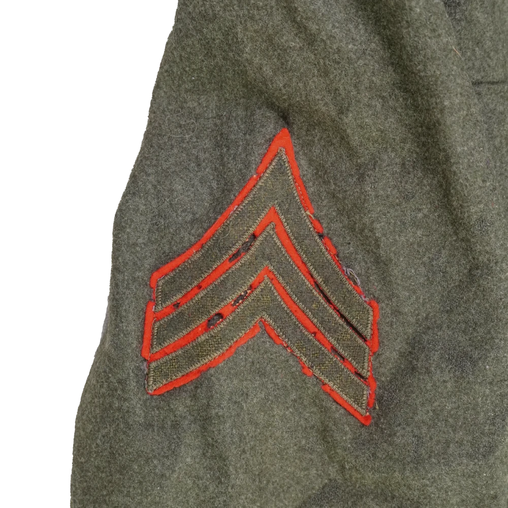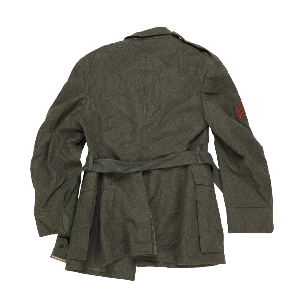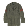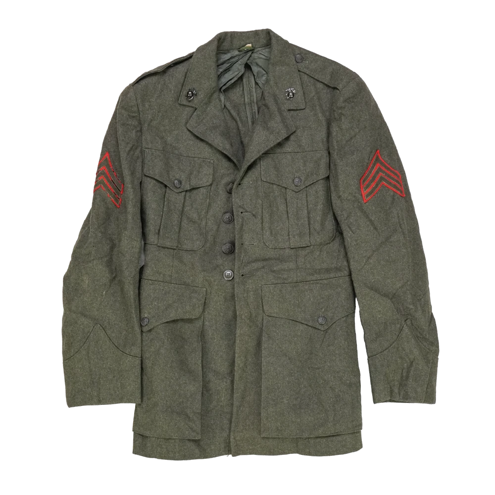 USMC WW2 wool service dress jacket with a higher wool content than later versions. Features a structured service cut with front button closure and internal lining.