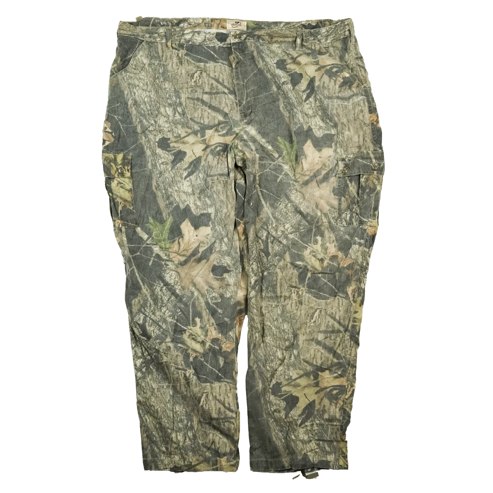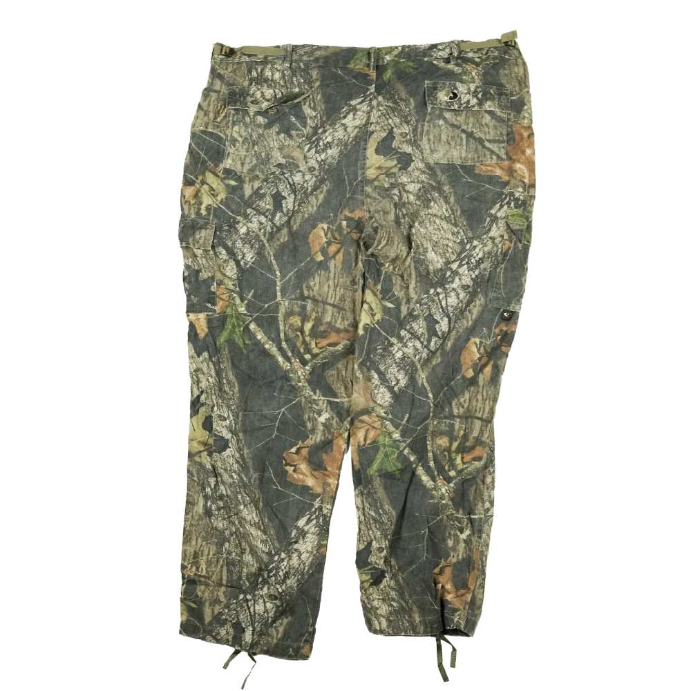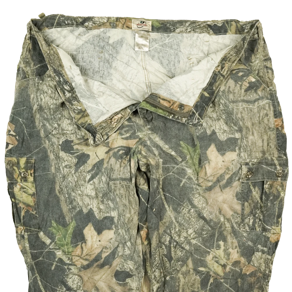 Vintage Mossy Oak hunting pants with a woodland camouflage pattern. These pants feature a straight-leg cut and multiple cargo pockets.