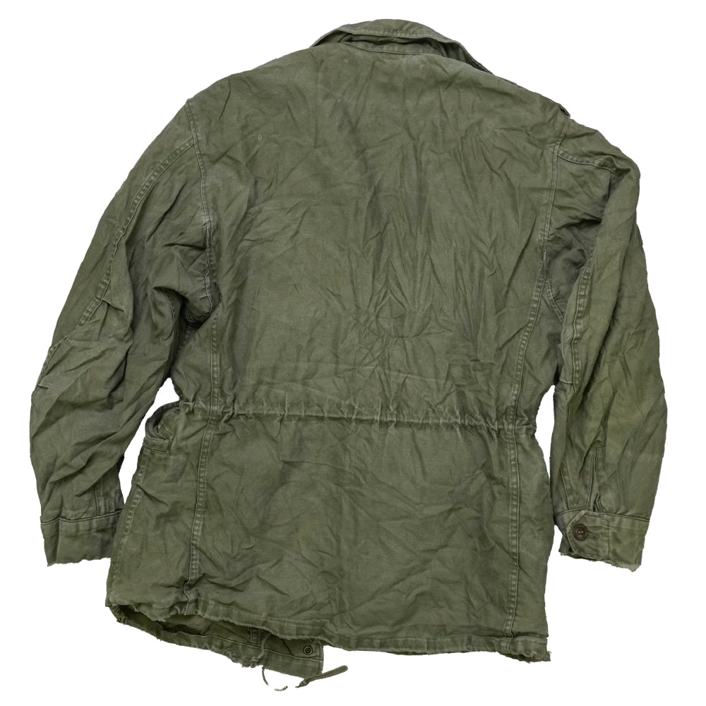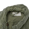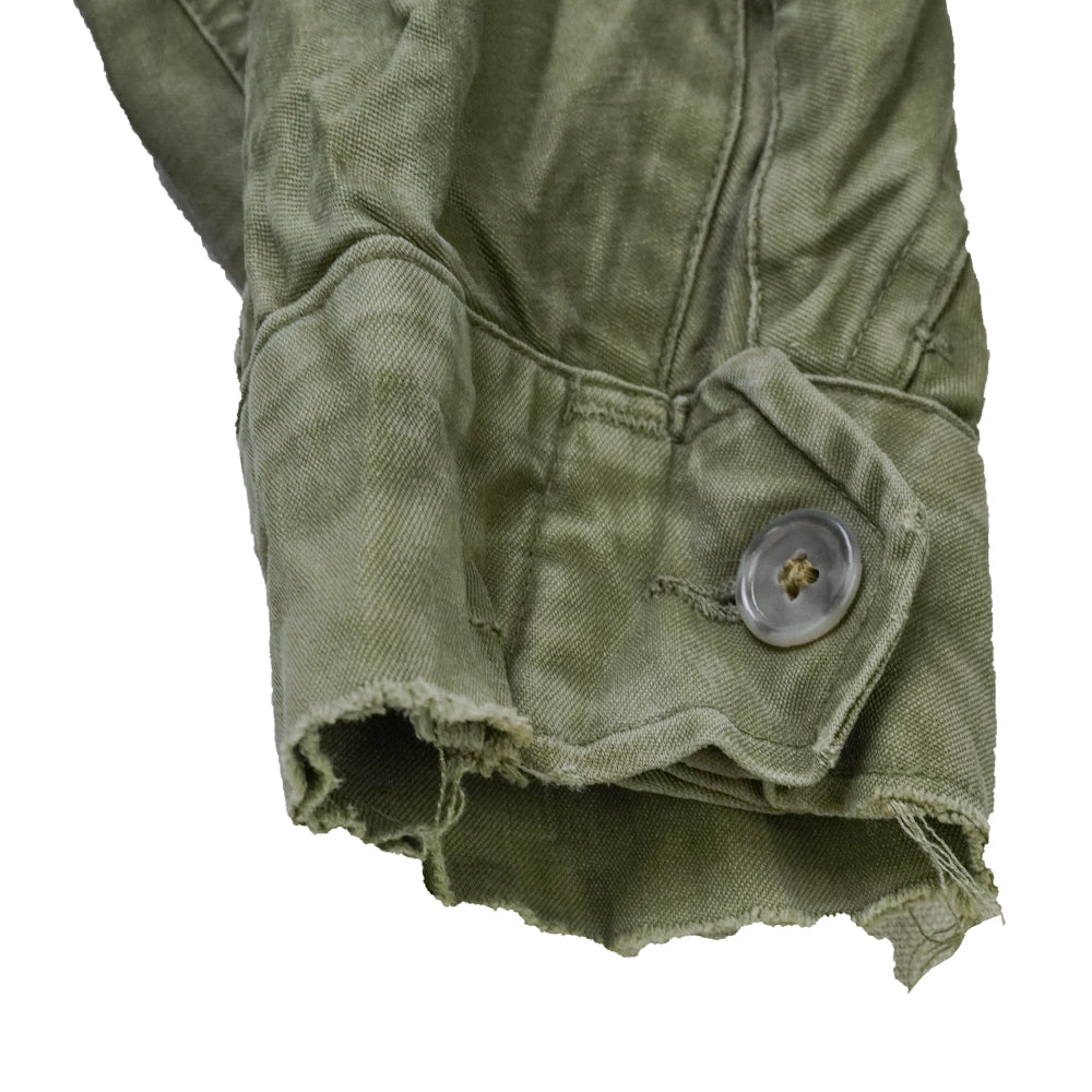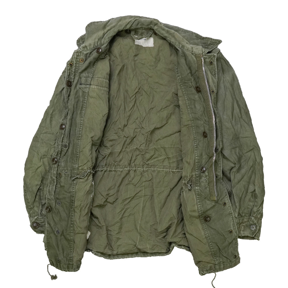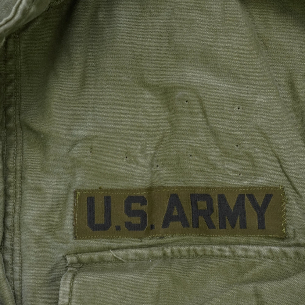 Frayed cuffs and multiple small holes on the front, back, and collar are present. Dated 1955, this is a mid-century U.S. Army field jacket in OG-107 configuration.