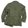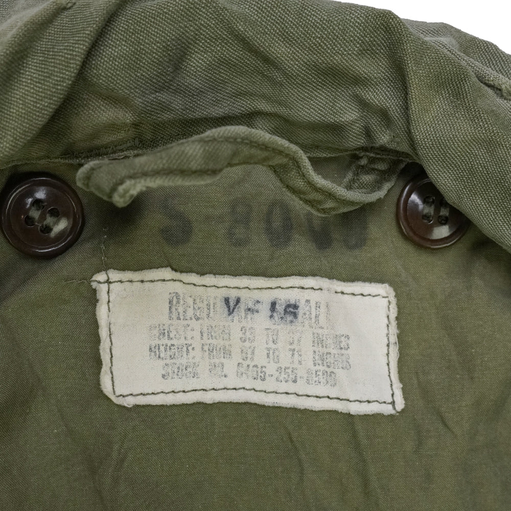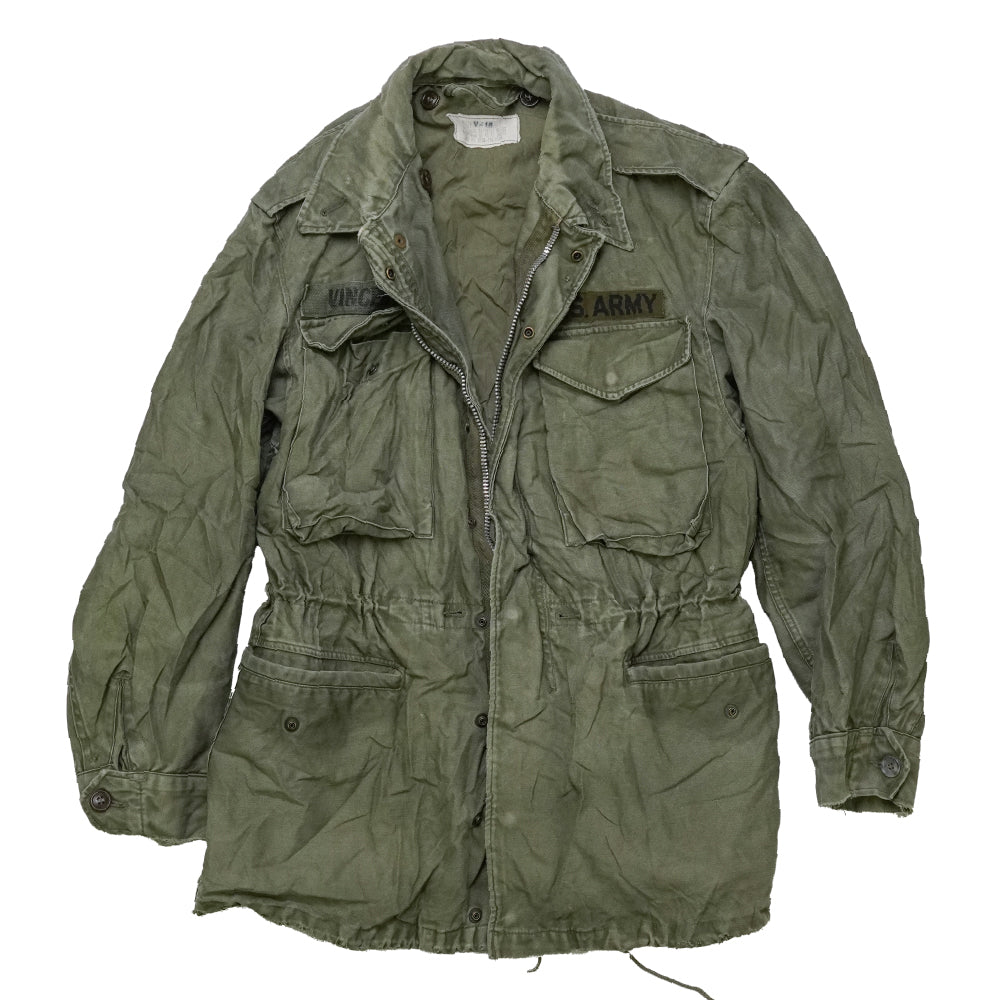 Original U.S. Army OG-107 field jacket dated 1955 in classic olive sateen. Tagged Small Regular with period name tape and visible service wear.