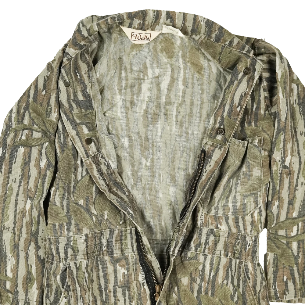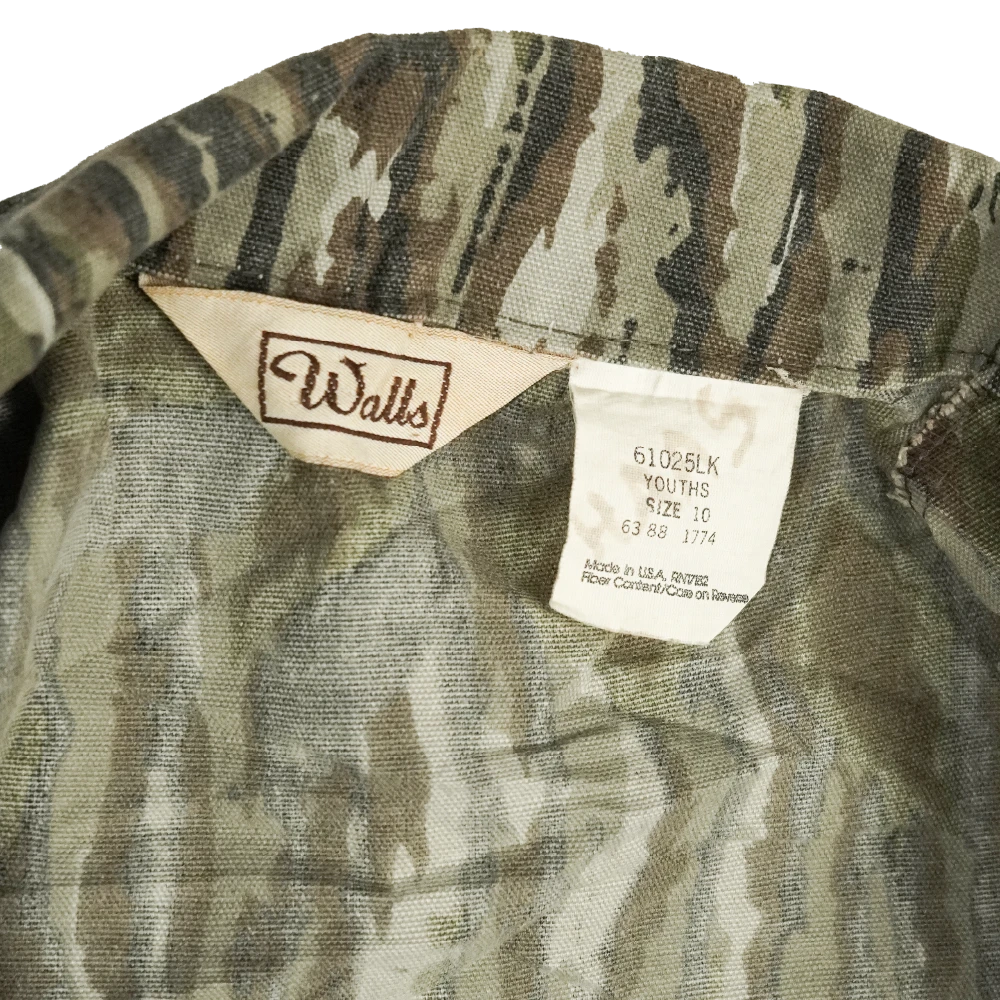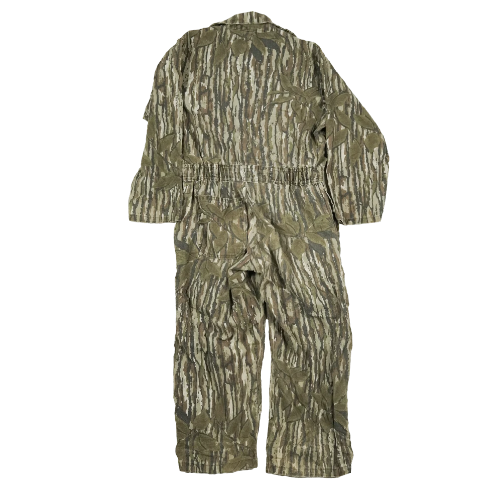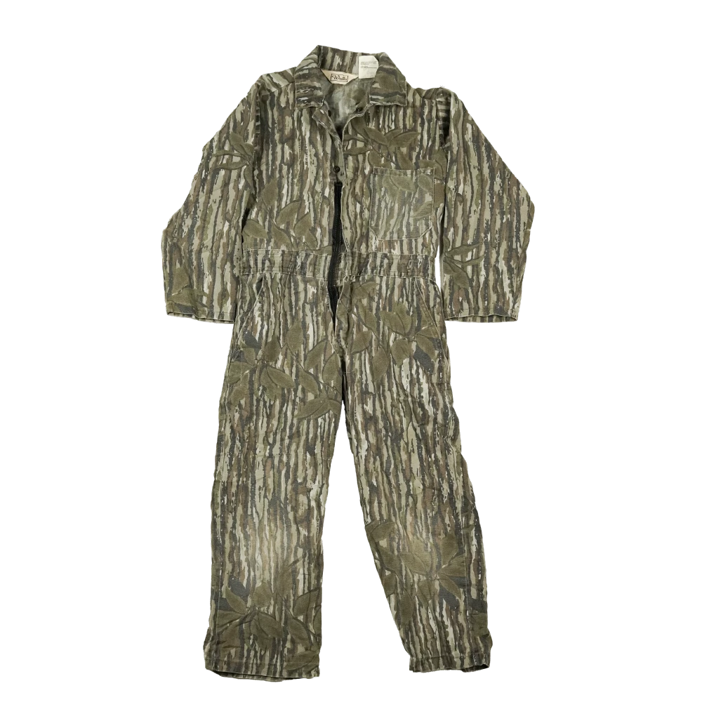 Commercial vintage Realtree-pattern overalls in youth size 10. One-piece overalls with camouflage print, sized for youth wear.