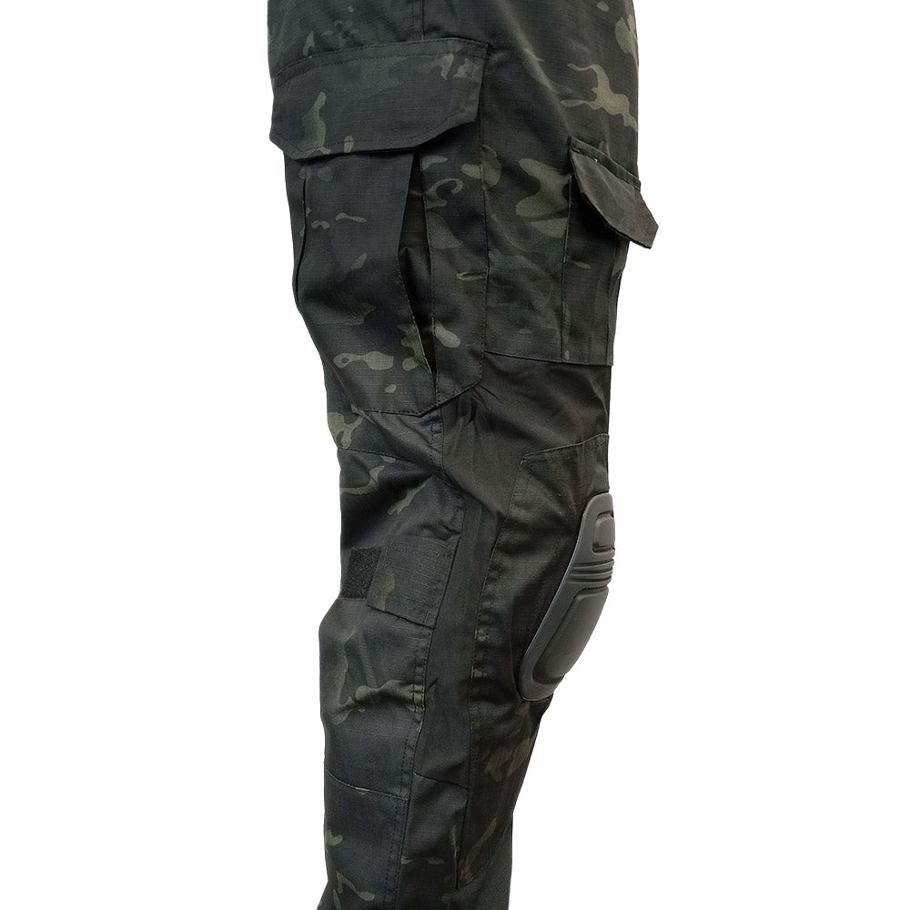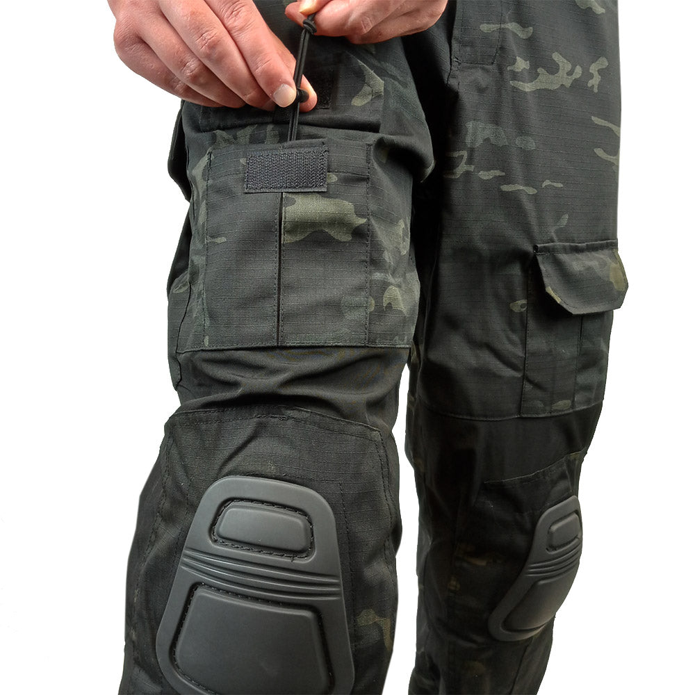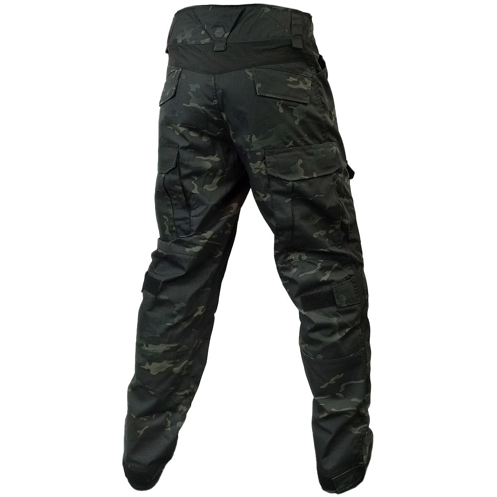 The biggest feature by far are the integrated knee pads - with these you don't have to worry about them sliding down your legs like regular pads. The trousers have slots the pads tuck into and have hook & loop internally to help keep them from popping out. Both the area around the pads and above the buttocks are made from a stretchy, breathable material to help contour with your body while you move. The rest of the trousers are made from durable rip-stop material covered in pockets. Complete in 'black multi camo' for all you urban ops fan boys (and girls!).