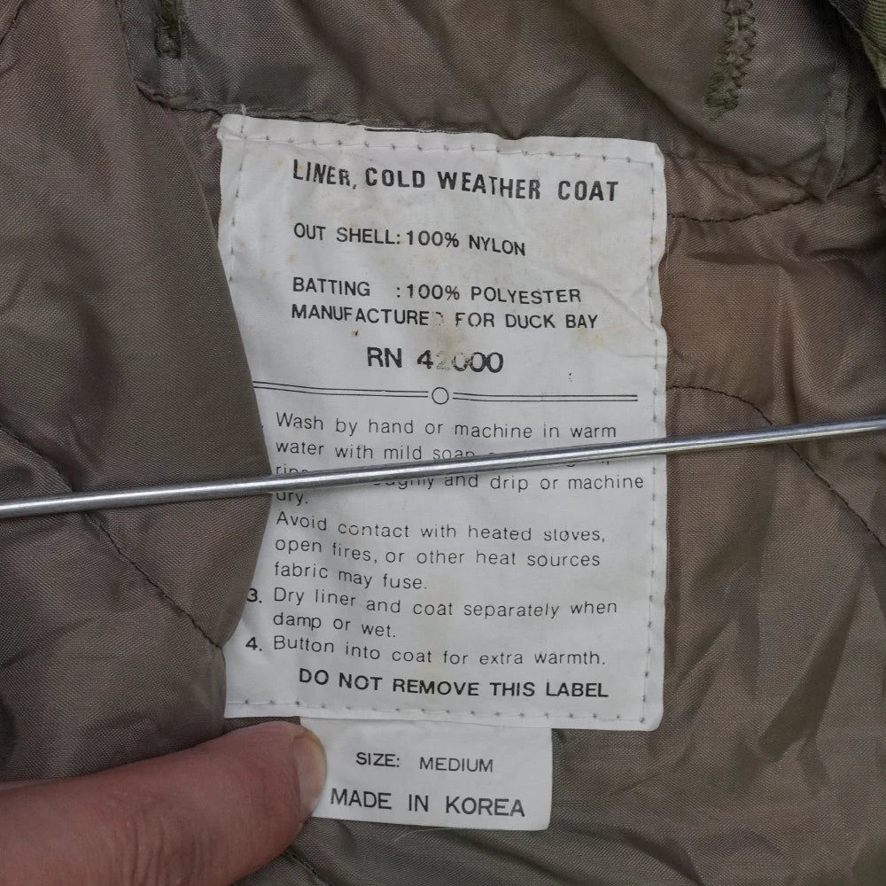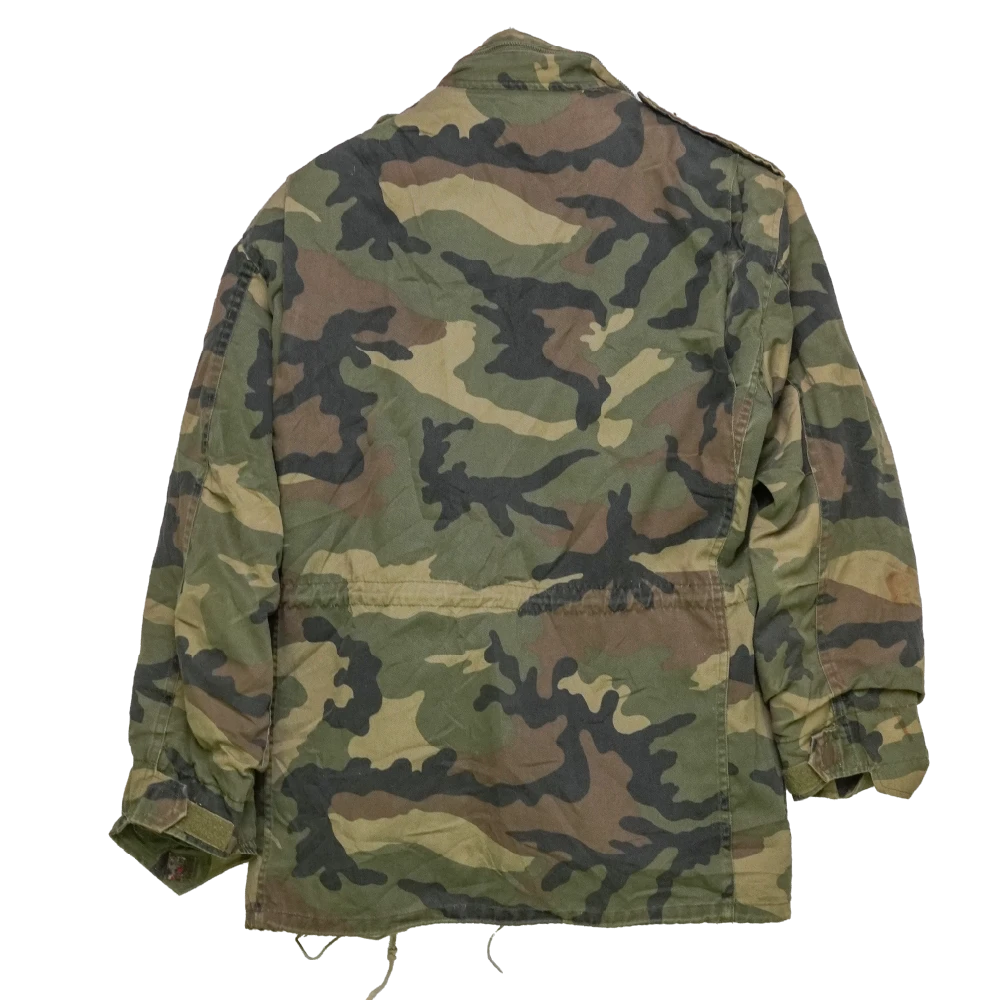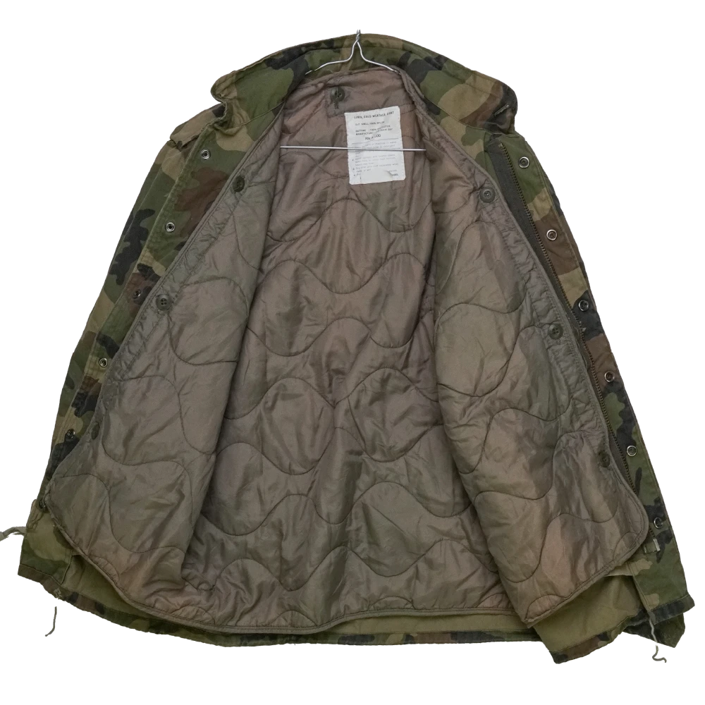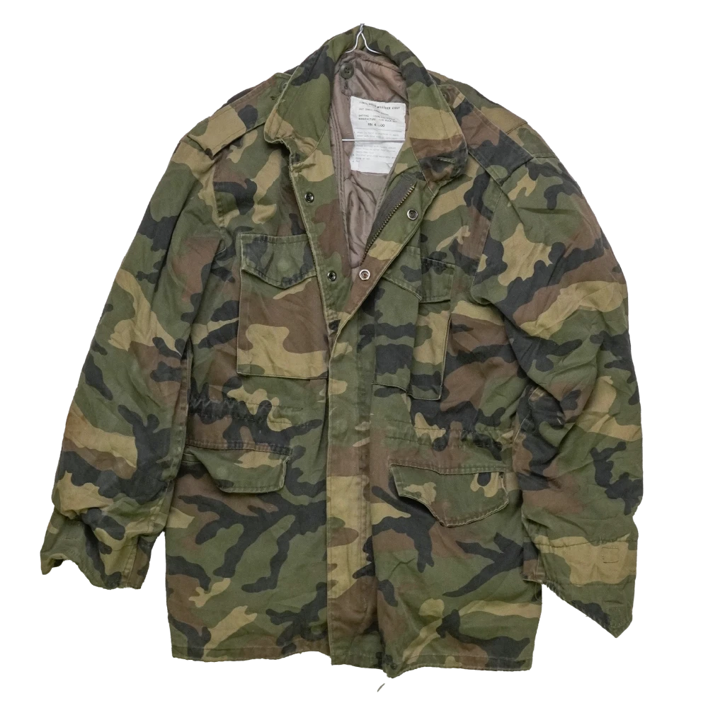 Commercial woodland M-65 style jacket with removable liner. Classic field jacket cut with front closure and multiple pockets.
