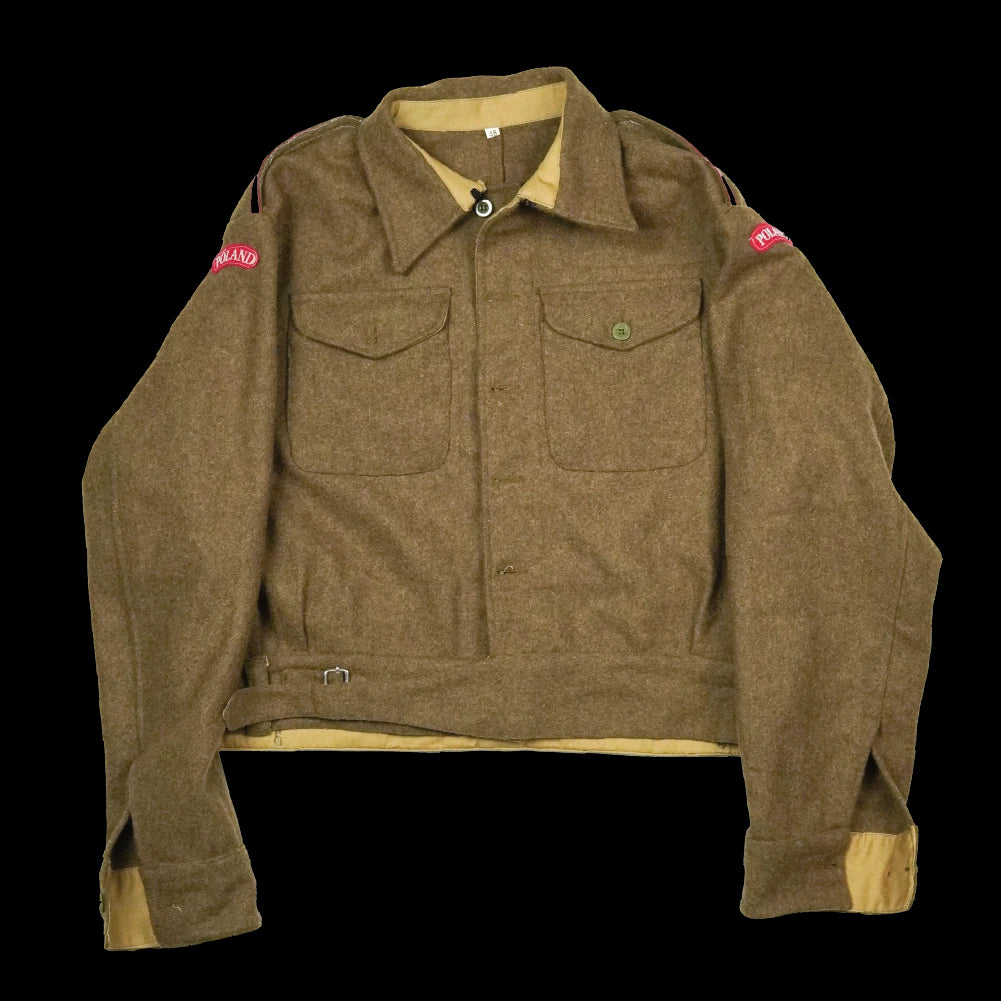 Reproduction of the WW2 British Pattern 1937 battledress jacket. This example features a button-front closure, two button-closure chest pockets, buttoned cuffs, and a buckled waist adjustment. Polish Army insignia is present on the jacket.