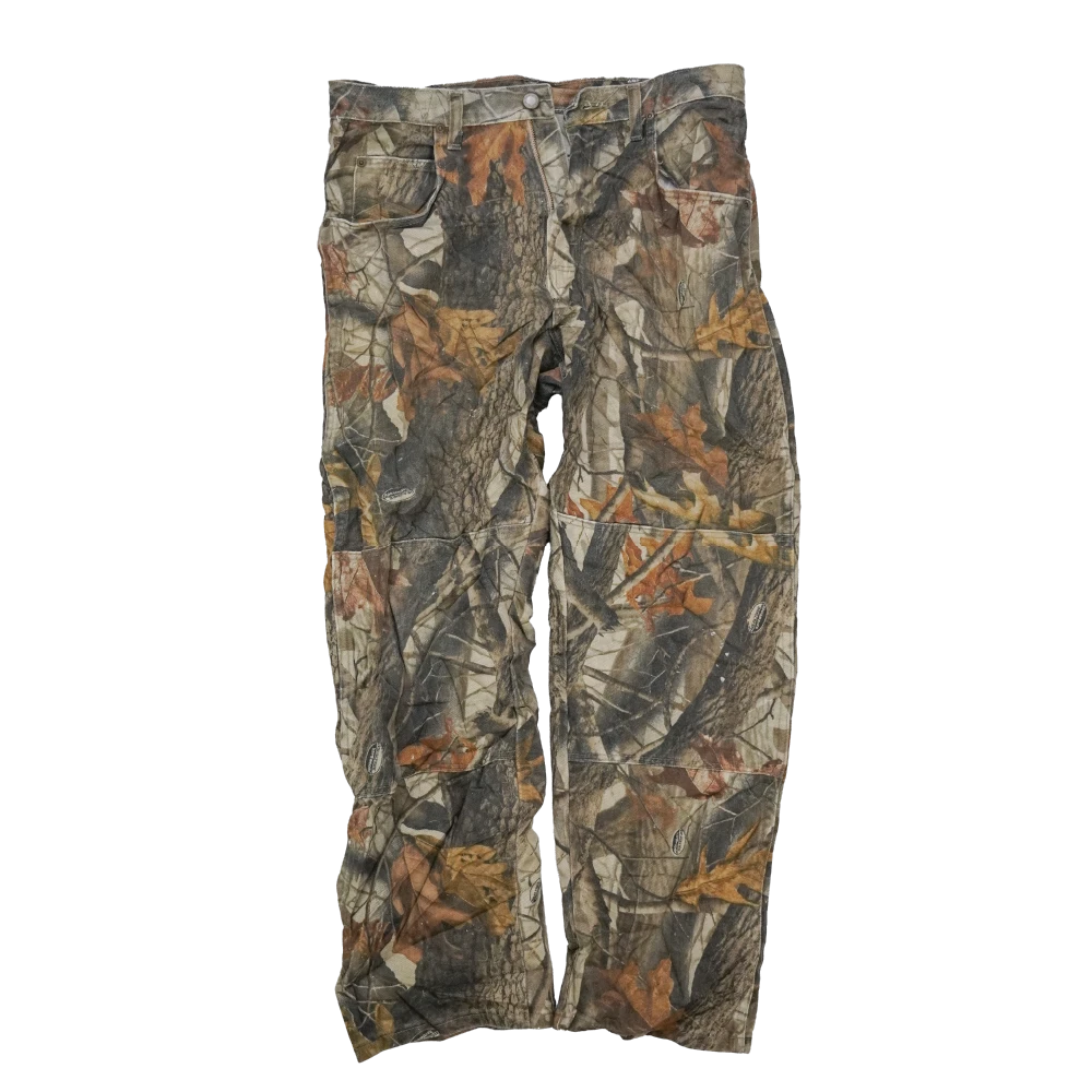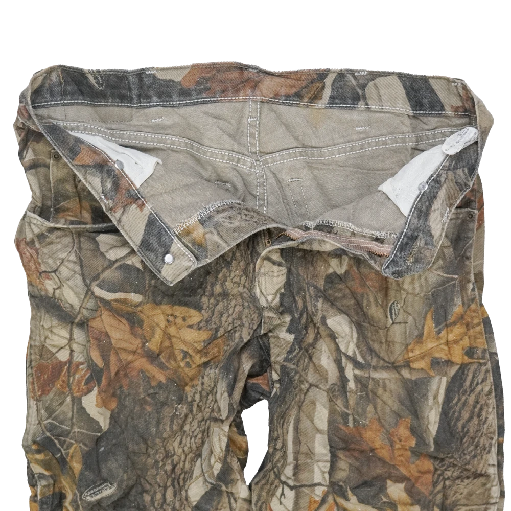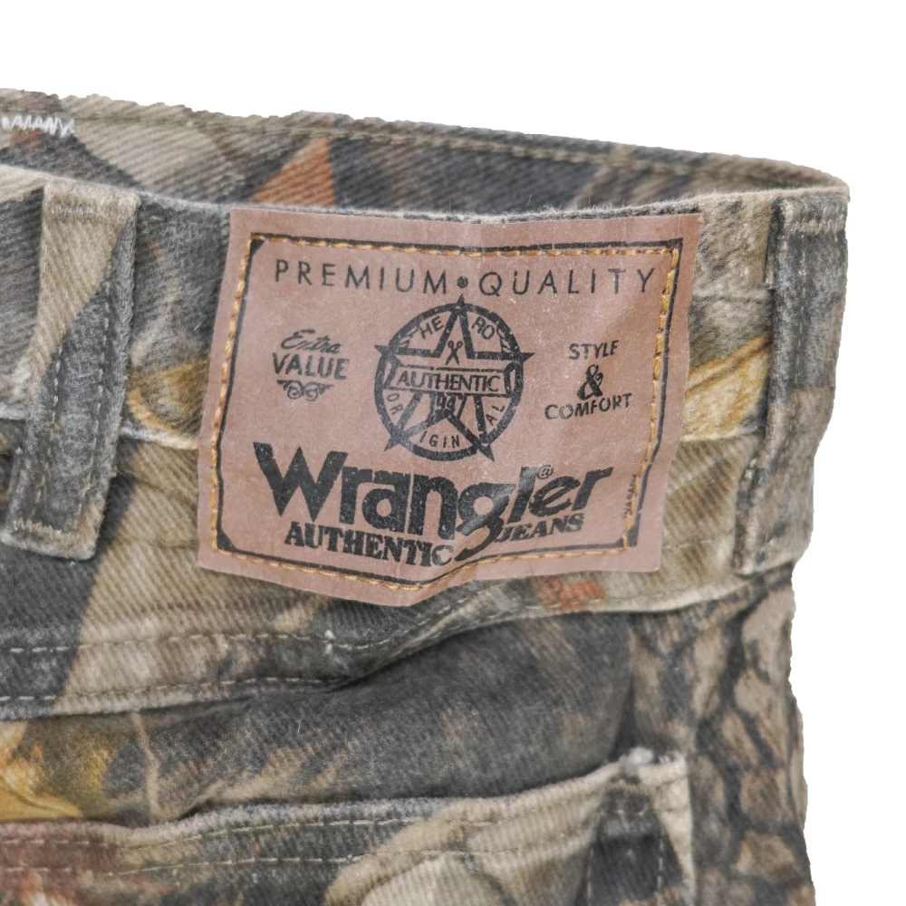 Commercial Wrangler jeans in Realtree camouflage pattern. Standard jean-style trousers with a camo print across the fabric.
