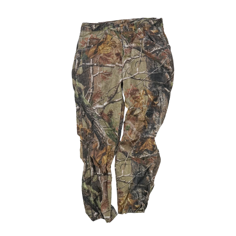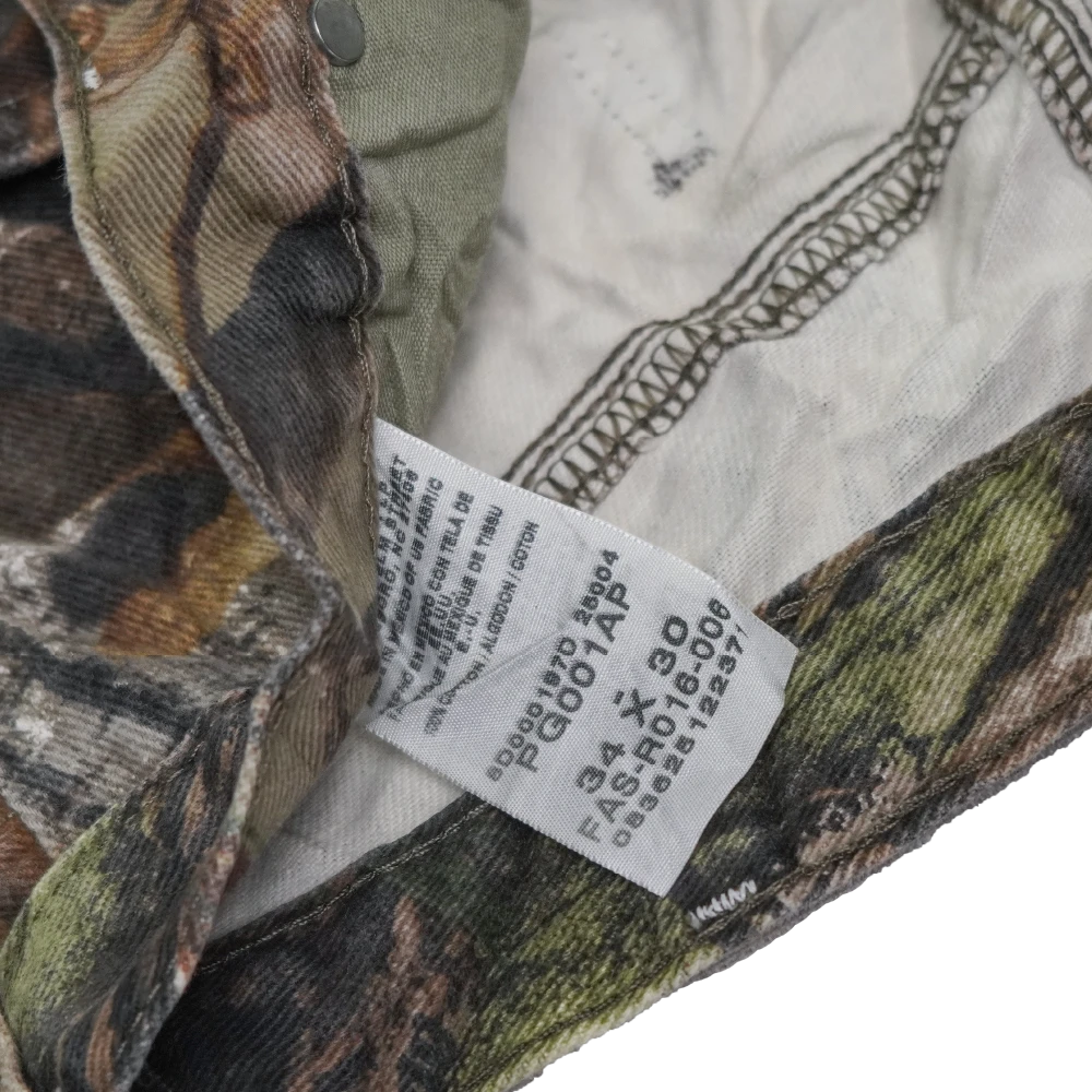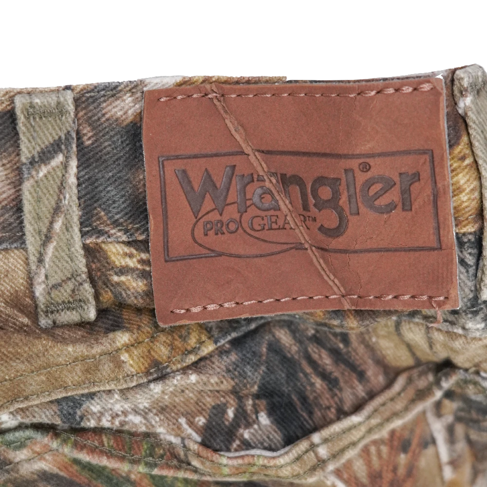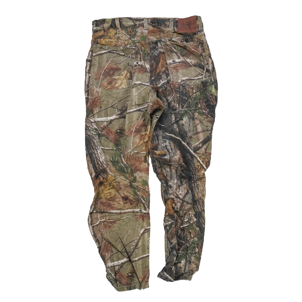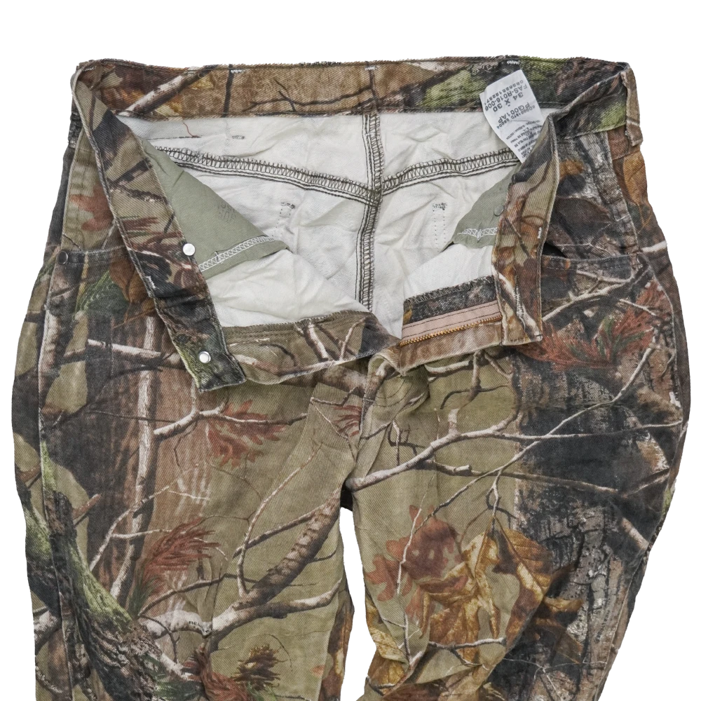 Wrangler Realtree camouflage jeans in a 34x30 size. Classic denim construction with a straight-leg cut and traditional five-pocket layout.