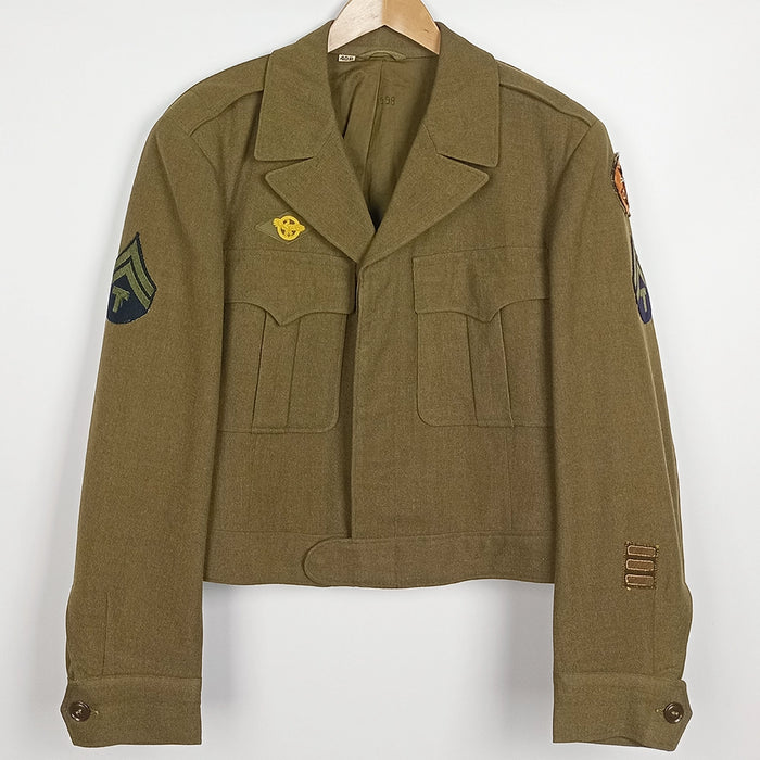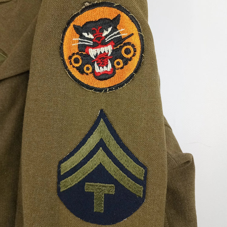 WWII wool Ike (M-1944, Eisenhower) jacket with Tank Destroyers, Technical Corporal, Honorable service and 1.5 years overseas bars.