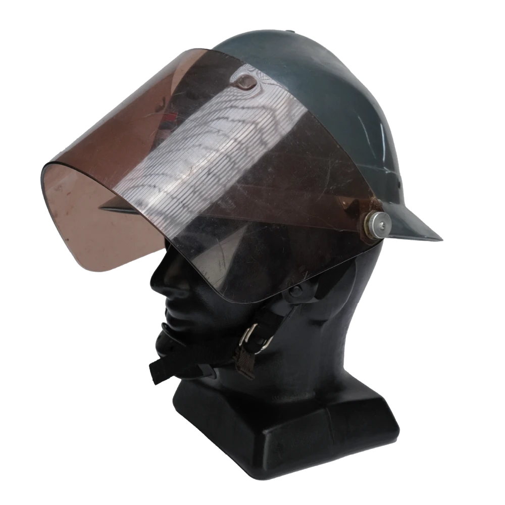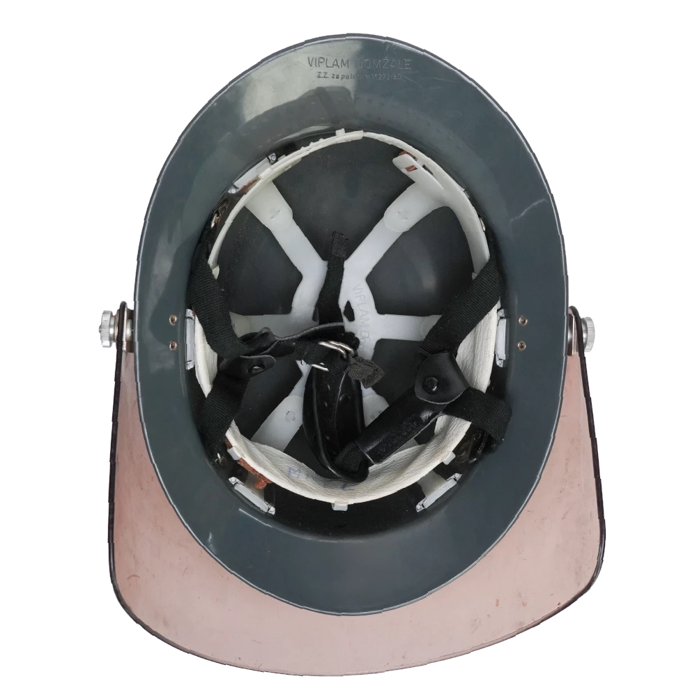 Yugoslavian M273/80 military firefighter helmet with integrated visor. Features a rigid outer shell and internal liner assembly. Foam padding around the liner has deteriorated.